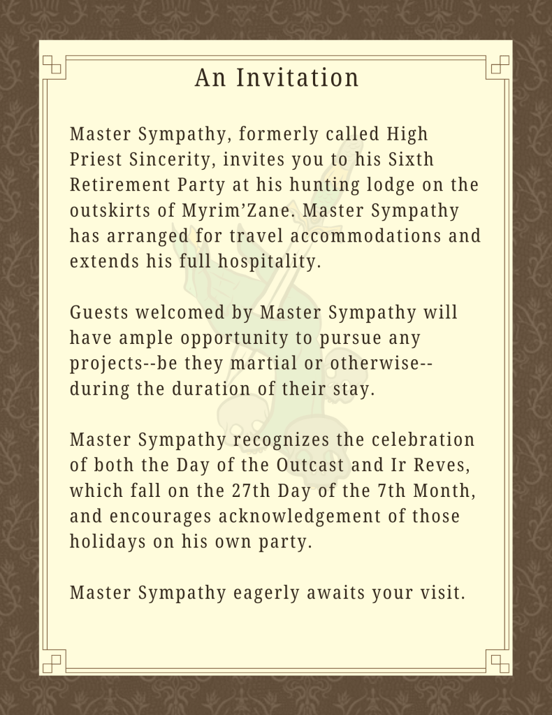 As a thank you to all players for enduring limited running water, a collapsing kitchen, and 6 inches of surprise snow, we will be running a free roleplay night. This will be held on Saturday, May 31, 2025, from 6pm-midnight in the American Grille at the Sturbridge Host Hotel and Conference Center. This will be a non-combat event but fully staffed. To make up for things that did not run during snowpacalypse, this event will occur, in-game, at Deathwalk during the Court of Keys. While the Court of Keys is technically a Kasamei summer holiday, we will observe it in-game in late May.