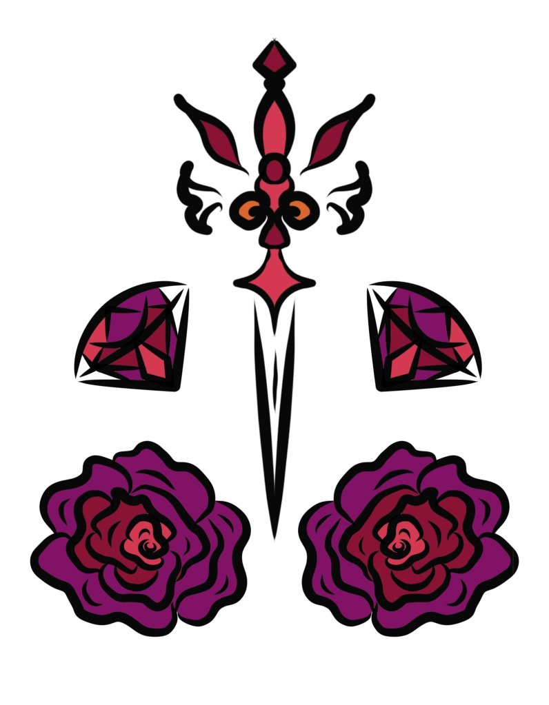 Symbols: an amethyst studded brass circlet, a bottle of poison, a bloody dagger, a mirror, a cow, roses, a chalice of wine, a black dragon